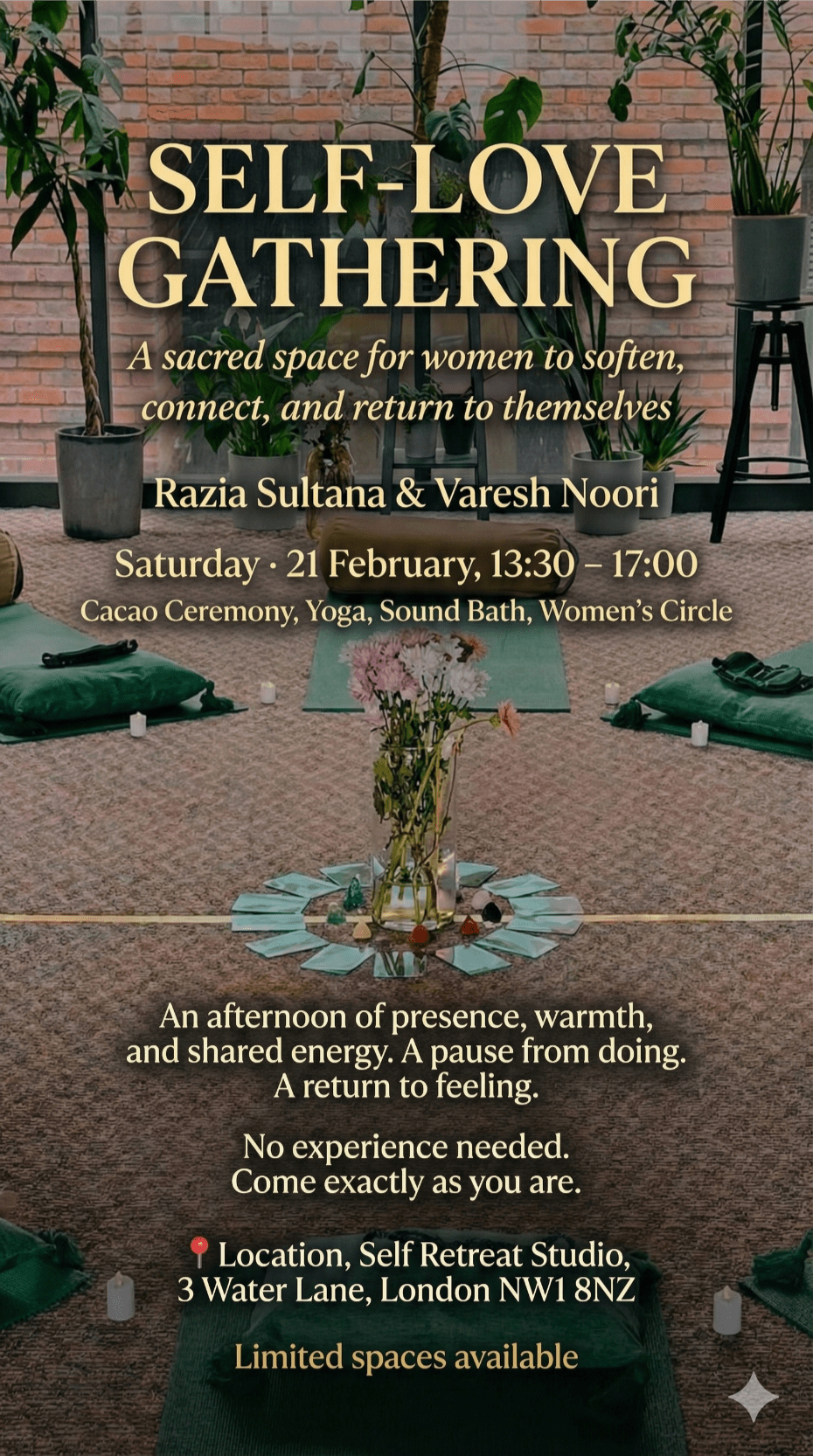 A sacred space for women to soften, connect, and return to themselves with Razia Sultana & Varesh Noori Saturday · 21 February 13:30 – 17:00 📍 Camden Limited spaces available …